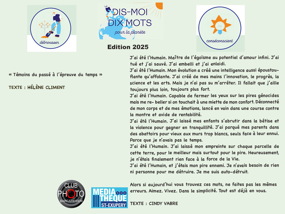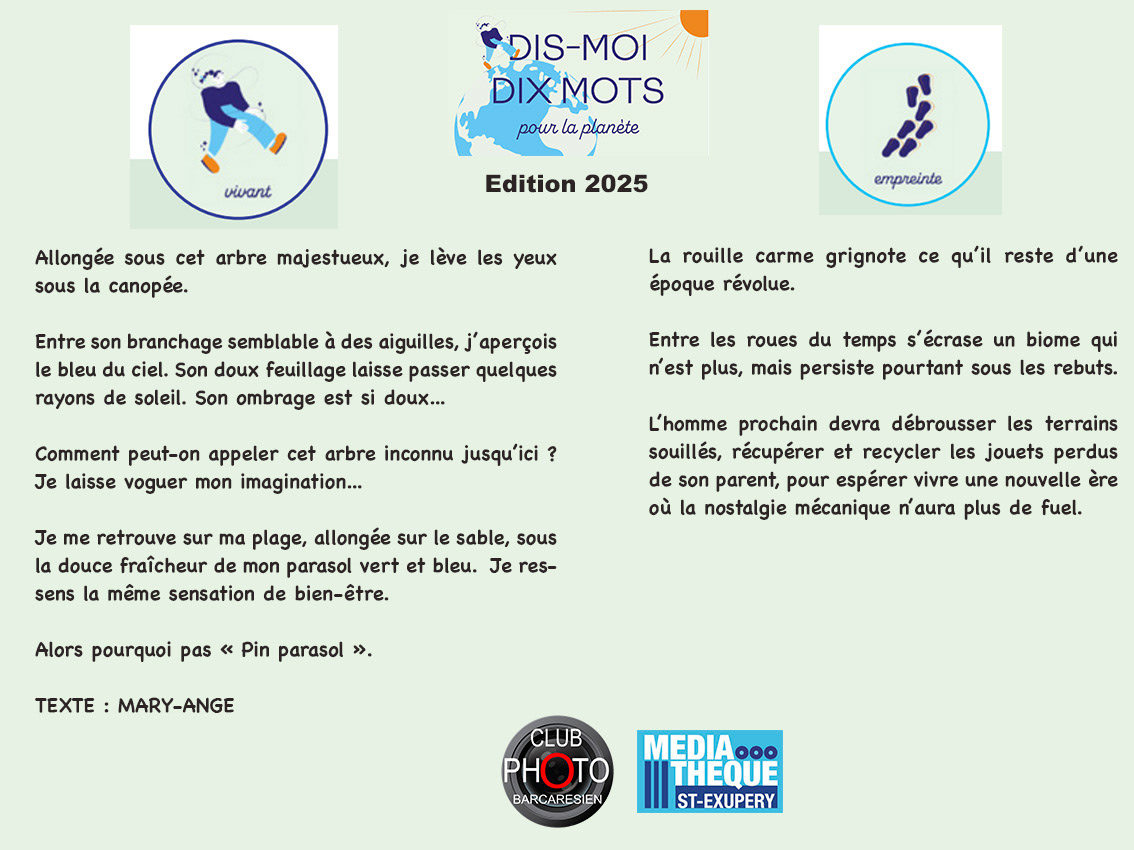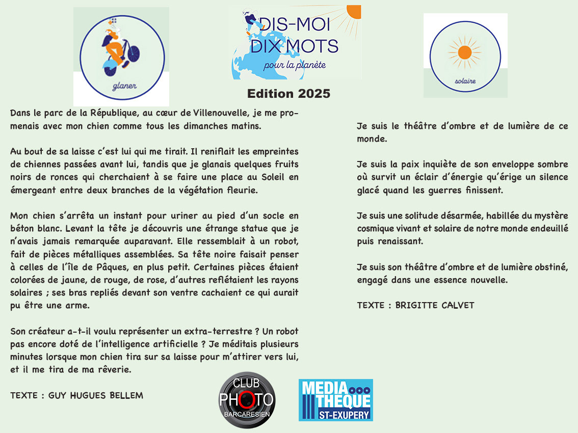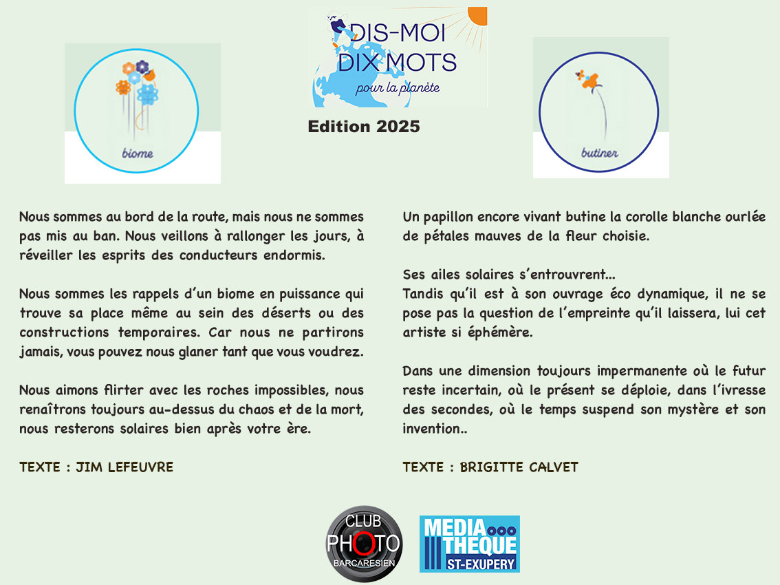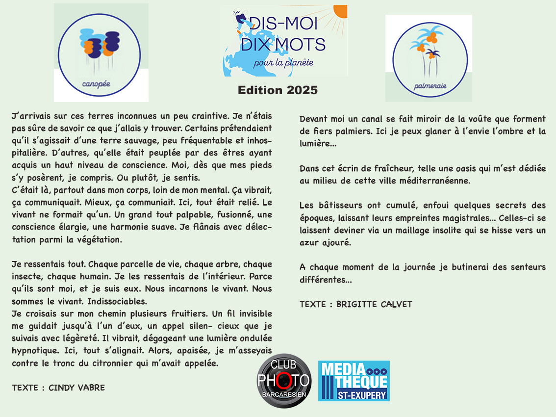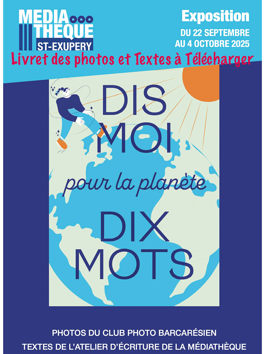 L'Exposition Dis Moi Dix Mots 2025, travail collaboratif entre le Club Photo Barcarésien et l'atelier d'écriture créative de la Médiathèque du Barcarès, se tient à la médiathèque du Barcarès jusqu'au 4 Octobre 2025. Elle sera ensuite exposée dans le Hall de la Mairie jusqu'au 31 Octobre.