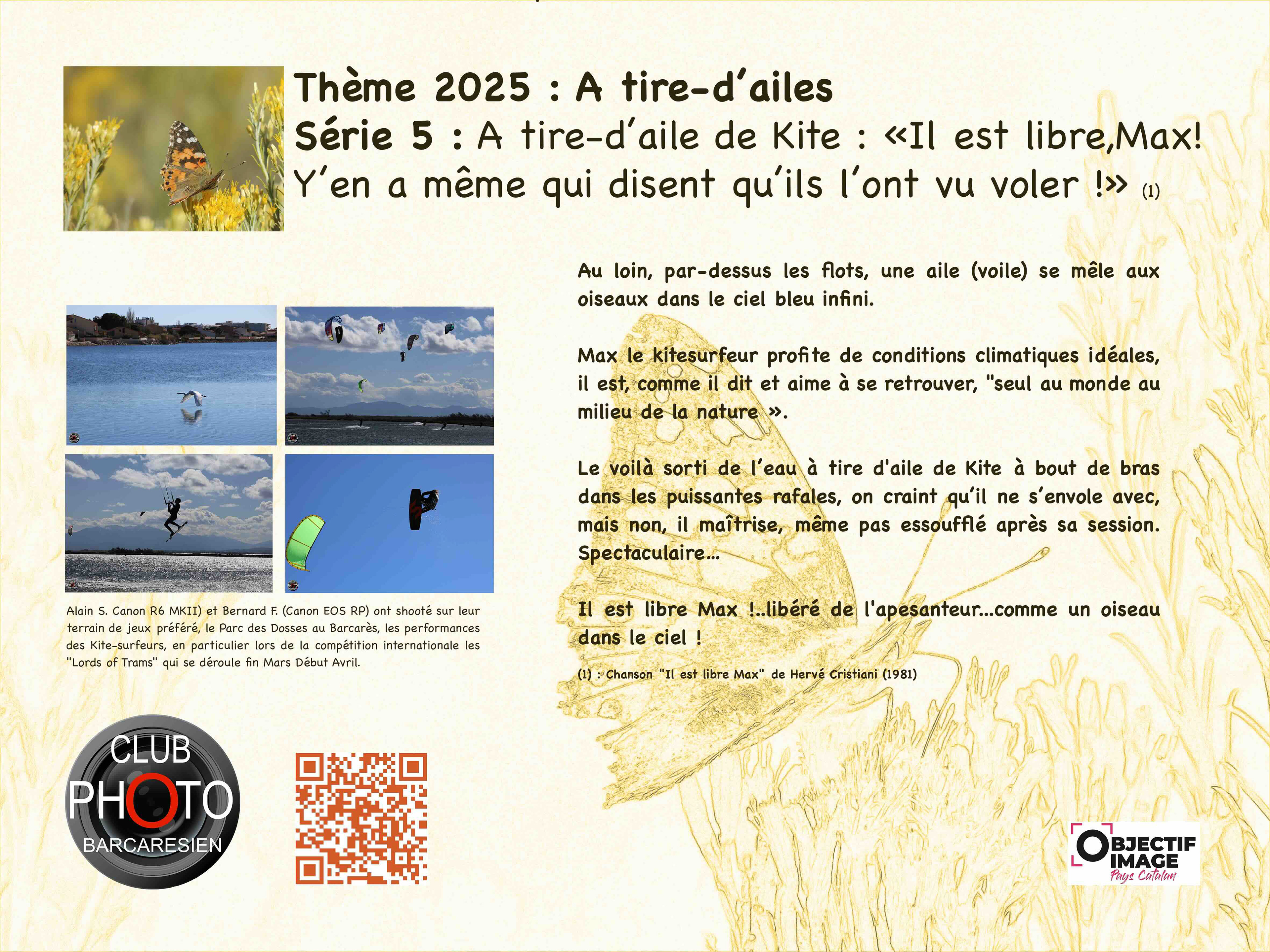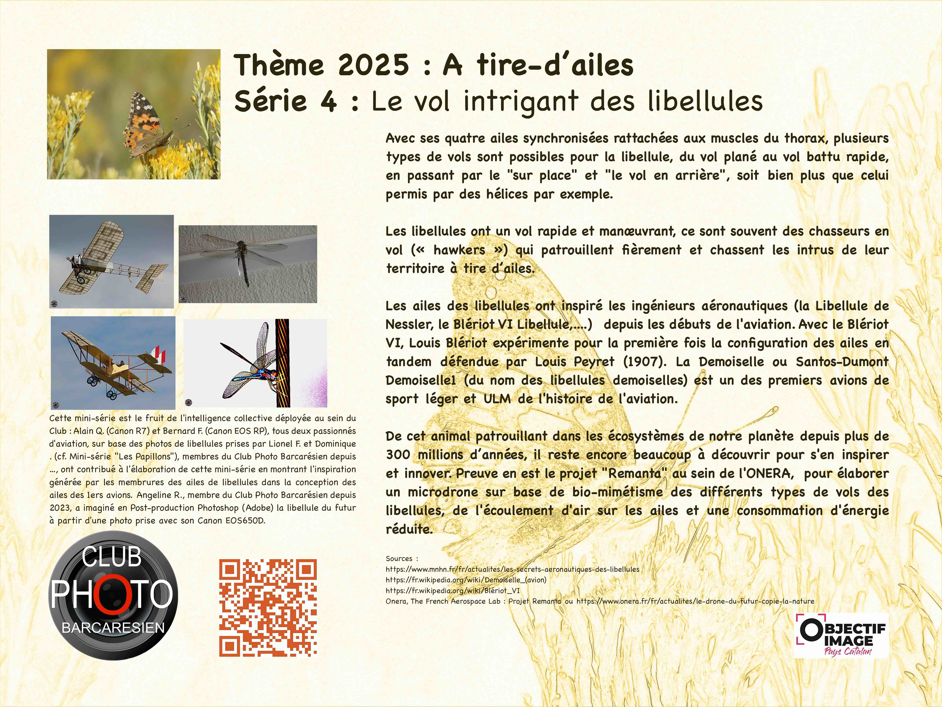 - Alain Q. (Canon R7) et Bernard F. (Canon EOS RP), tous deux passionnés d'aviation, sur base des photos de libellules prises par Lionel F. et Dominique . (cf. Mini-série "Les Papillons"), membres du Club Photo Barcarésien depuis ..., ont contribué à l'élaboration de cette mini-série en montrant l'inspiration générée par les membrures des ailes de libellules dans la conception des ailes des 1ers avions. Angeline R., membre du Club Photo Barcarésien depuis 2023, a imaginé en Post-production Photoshop (Adobe) la libellule du futur à partir d'une photo prise avec son Canon EOS650D.
