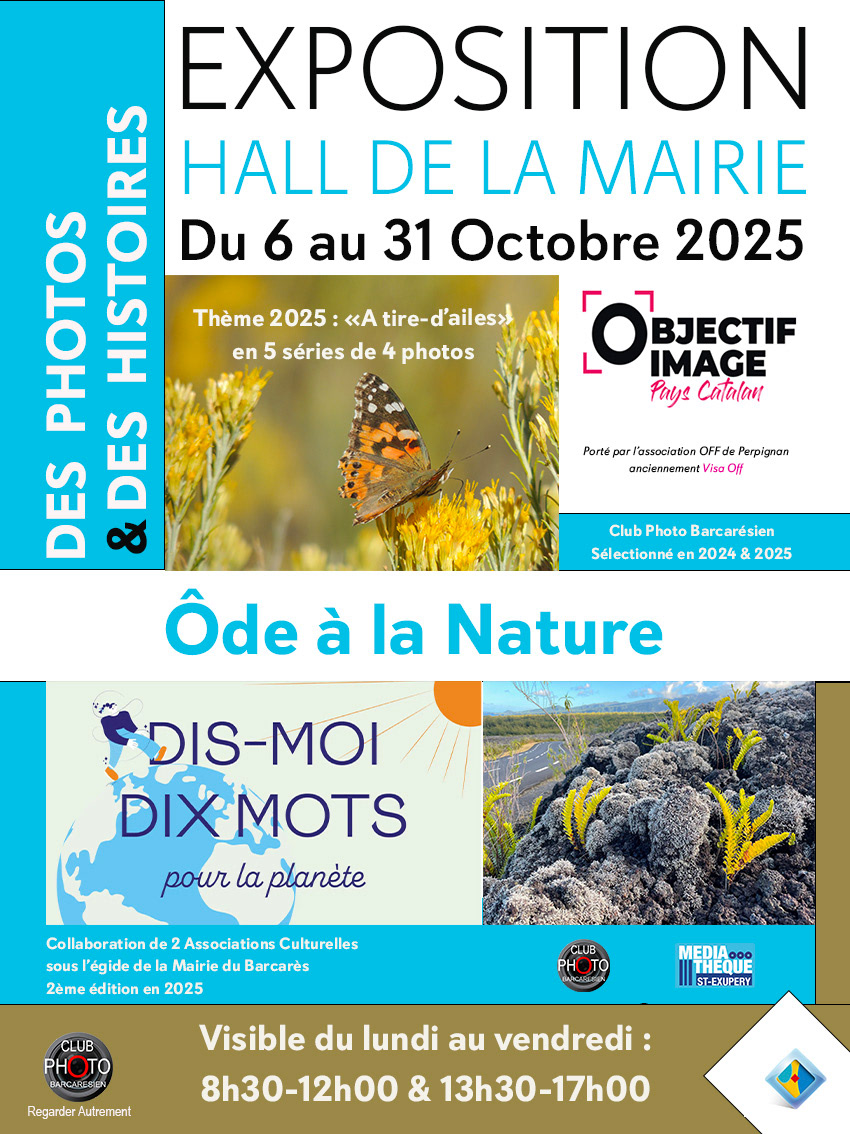 L'exposition du Club Photo Barcarésien, Association culturelle du Barcarès, se tient dans le hall de la Mairie du Barcarès, du 6 au 31 Octobre 2025 et a pour thème « Ôde à La Nature » s'appuyant sur les 2 expositions suivantes :