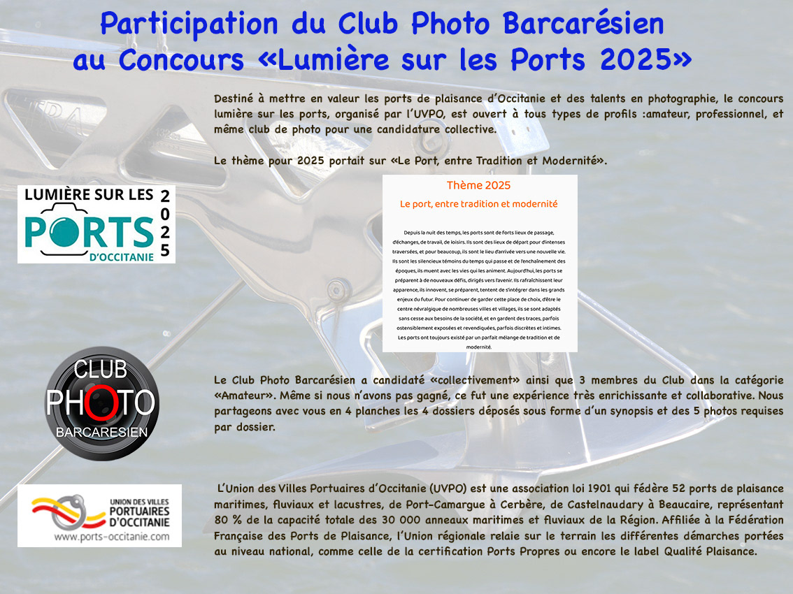 Cette exposition est complétée par les planches réalisées par le Club et 3 de ses membres dans le cadre du concours « Lumière sur les Ports » mené à l’initiative de l’UVPO, dont le thème 2025 était « Entre tradition et Modernité ».